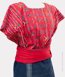 The corte or skirt is woven on a treadle loom. The two panels that make it up feature a predominantly blue with narrow white lines arranged at regular intervals. The sash shares the huipil’s intense red background though it is more restrained in design, as it lacks brocading and it only has striped patterns created through color changes in the warp.