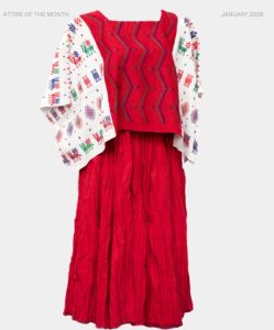 In addition to the huipil, the attire is completed by a red corte (skirt) with black checkered patterns, woven on a treadle loom. This is an old style that remains in use in the municipality.